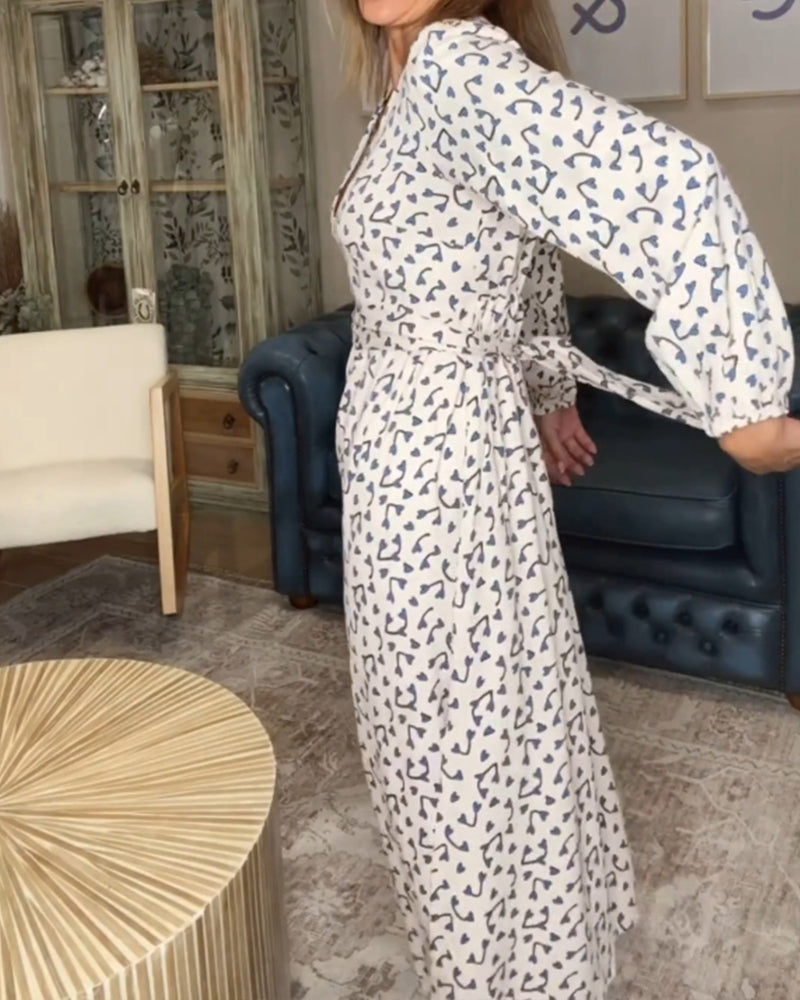 The Celeste A-line Dress features a stylish V-neckline and a beautiful print design. This midi-length dress is perfect for casual wear, making it suitable for everyday occasions. The long lantern sleeves add a unique touch, while the lace-up detail and slit provide a modern flair. The overall look is both comfortable and fashionable, ideal for spring, summer, and fall seasons.