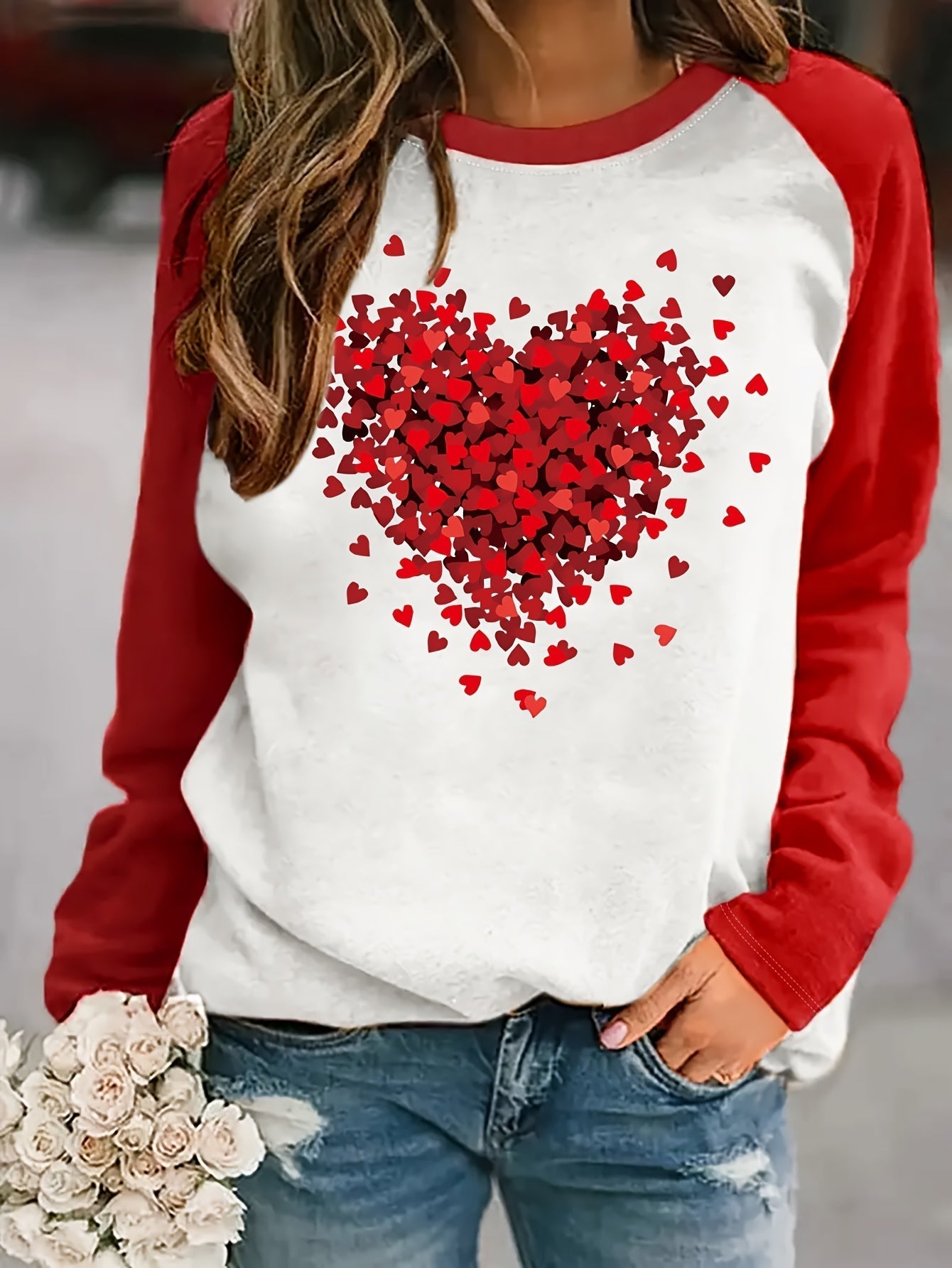 features a casual design with a round neck and a playful heart print. The overall look is relaxed and comfortable, making it suitable for everyday wear. The fabric has a soft feel and a slightly elastic quality, allowing for ease of movement. This sweatshirt is perfect for layering during the spring and autumn seasons, providing light warmth while maintaining a stylish appearance.