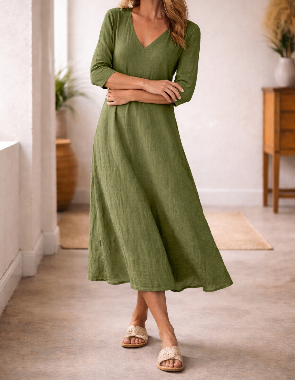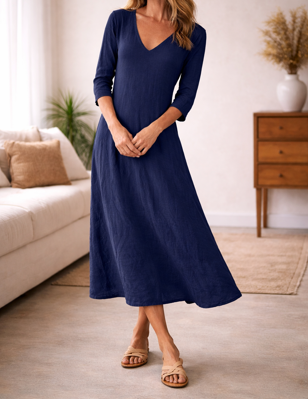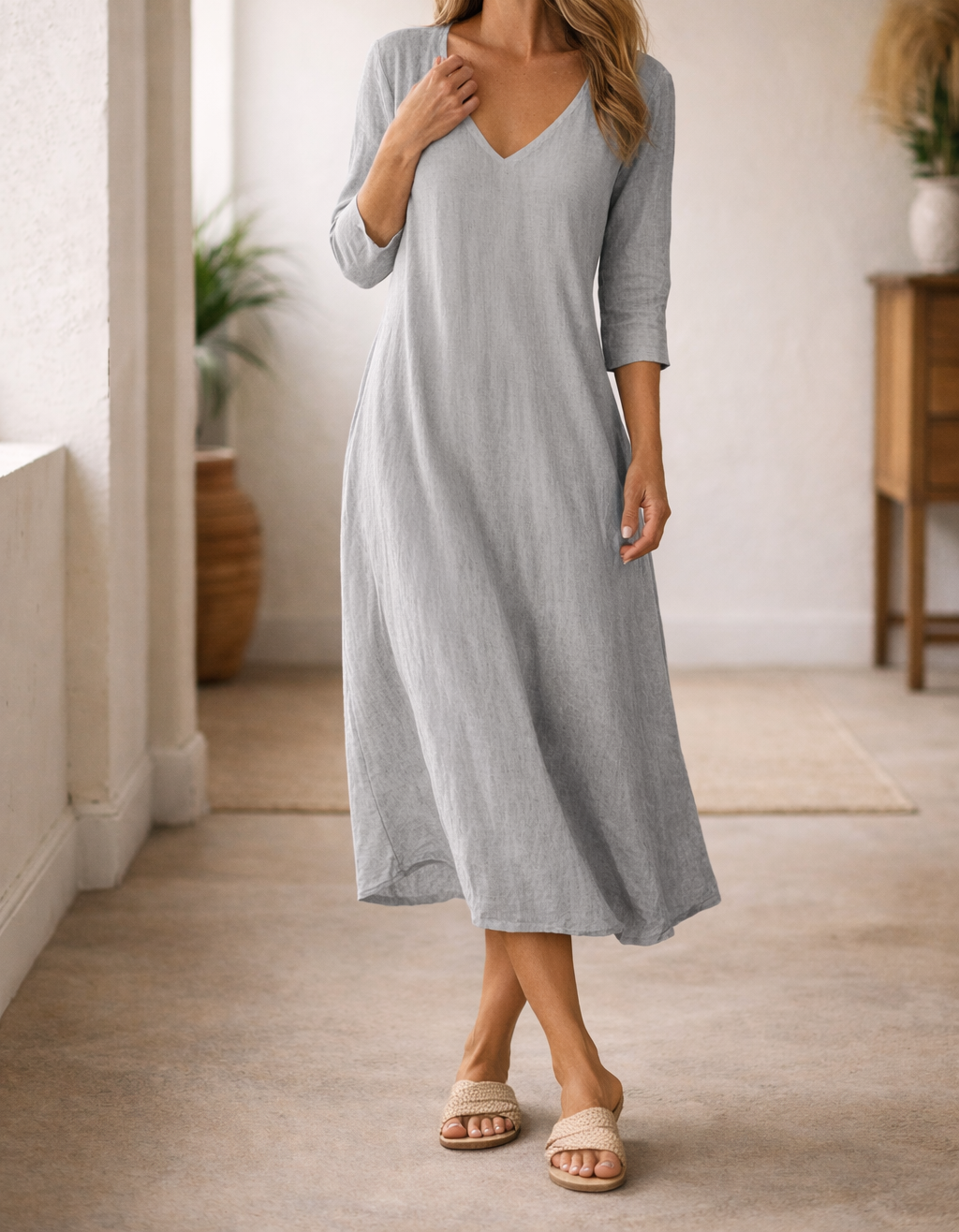 This women's dress is designed with a flattering V-neckline and 3/4 sleeves. The flowing silhouette creates a casual and elegant look, perfect for a variety of occasions. The dress is ideal for both beach walks and casual outings with friends.