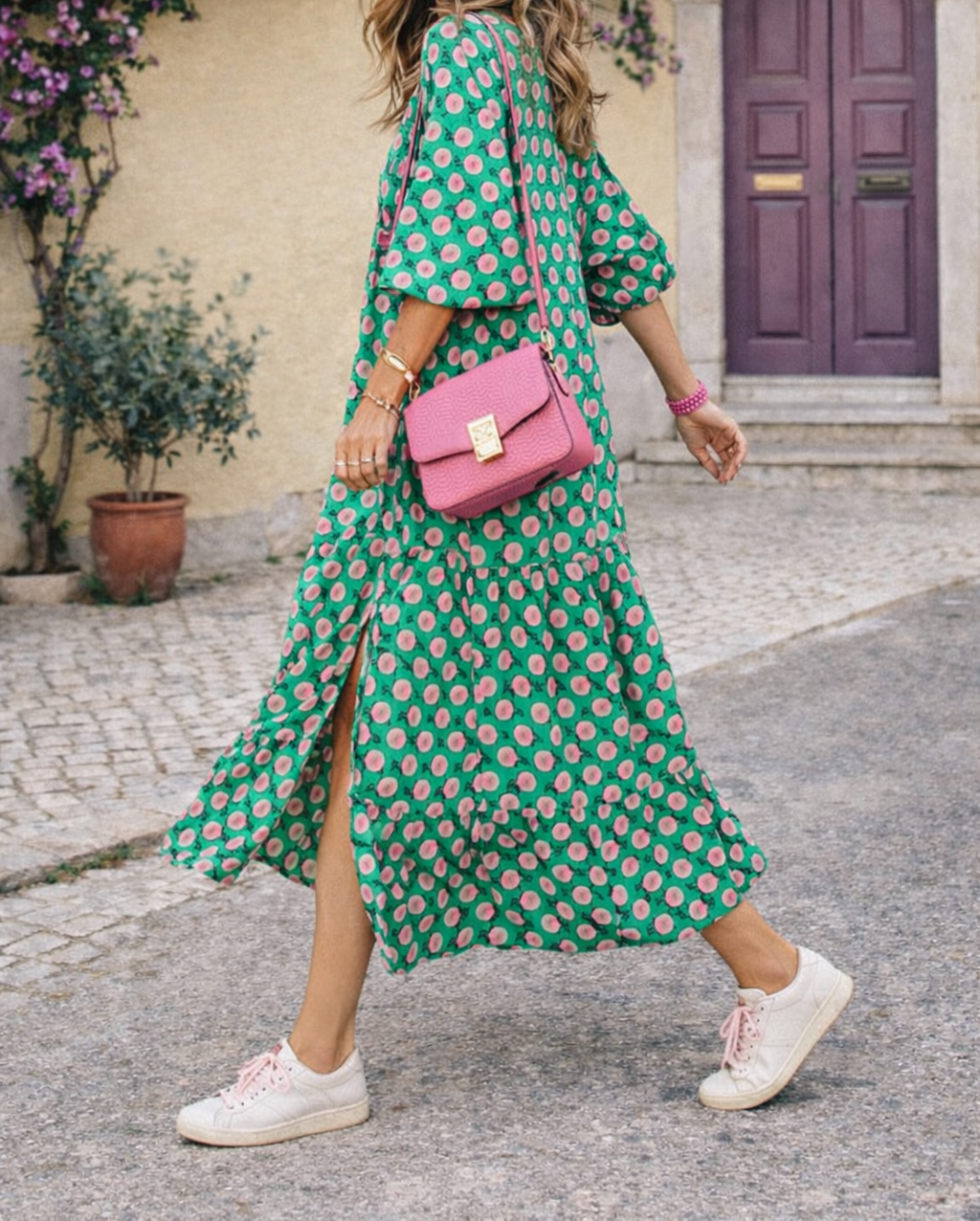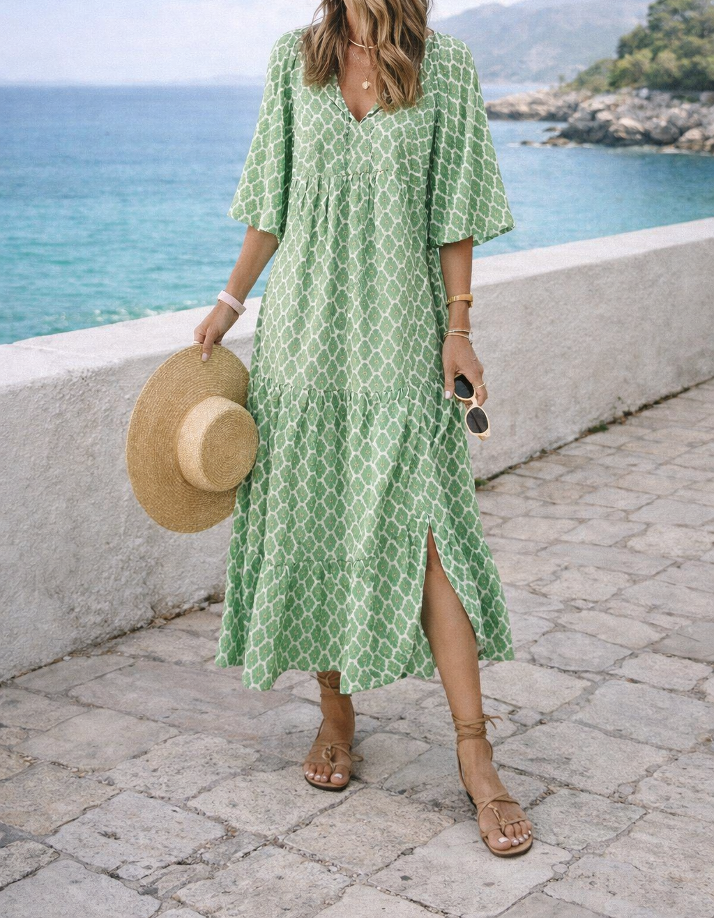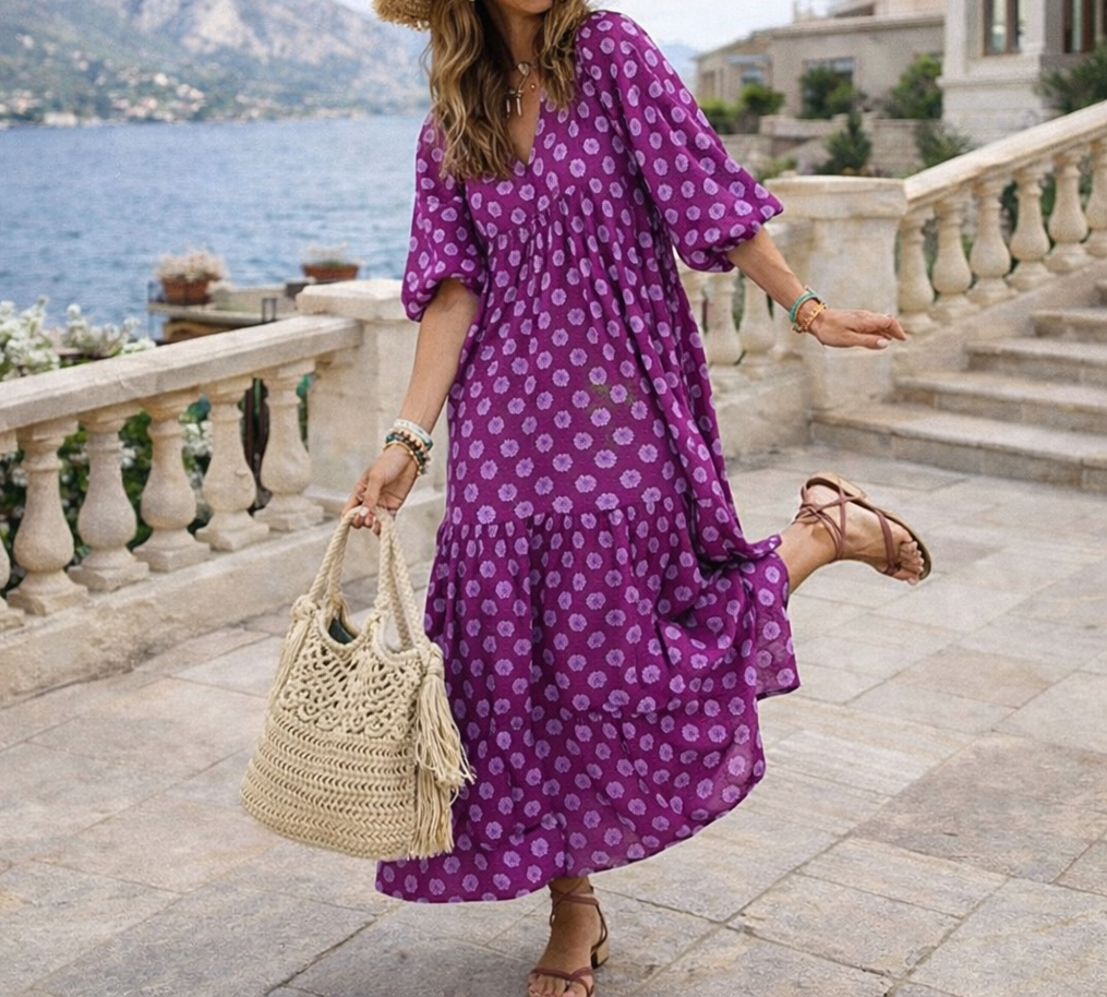 The maxi dress is a light and airy piece that offers a relaxed midi silhouette. It features a V-neckline and short, fluttery sleeves that create a flattering look. The dress is designed to be both comfortable and stylish, perfect for warm days. The playful hem dances around your calves as you walk, creating an elegant movement.