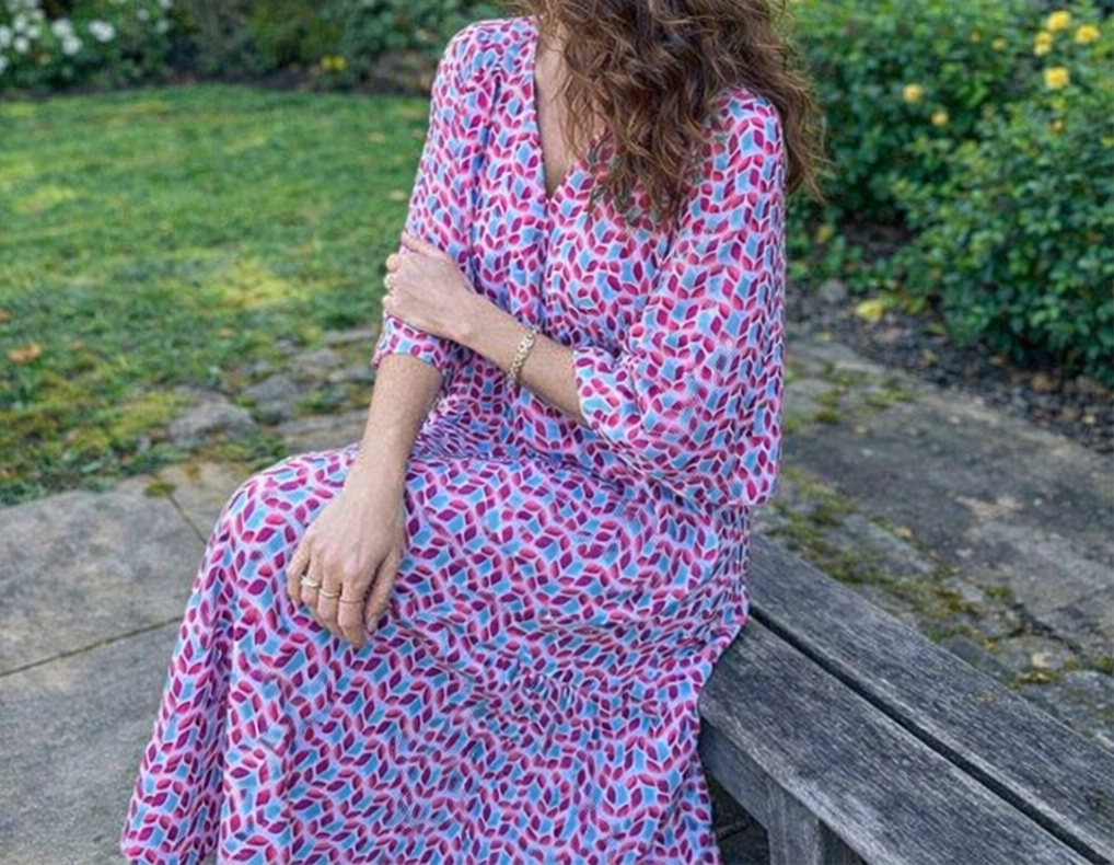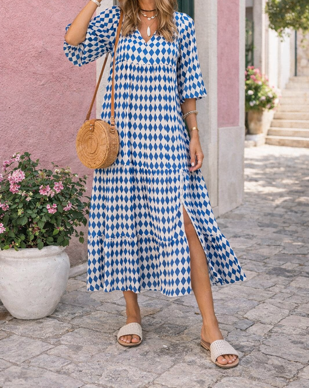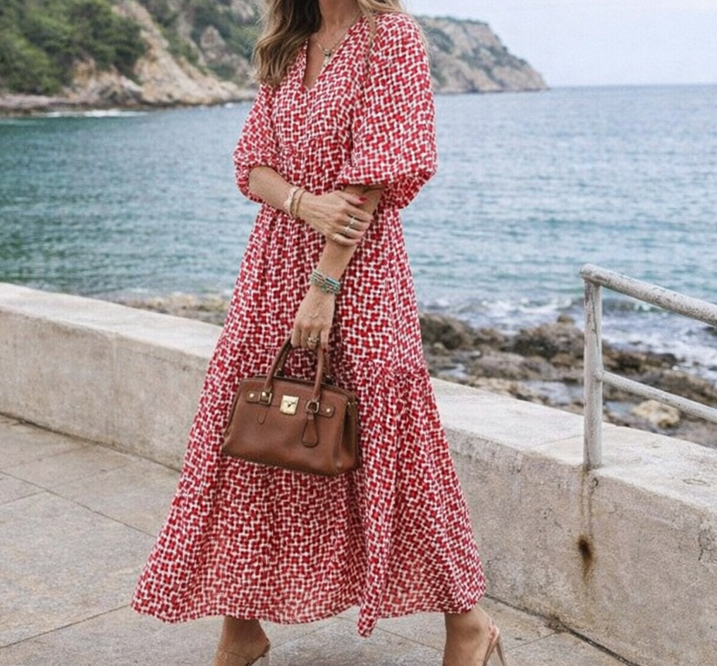 The maxi dress is a light and airy piece that offers a relaxed midi silhouette. It features a V-neckline and short, fluttery sleeves that create a flattering look. The dress is designed to be both comfortable and stylish, perfect for warm days. The playful hem dances around your calves as you walk, creating an elegant movement.