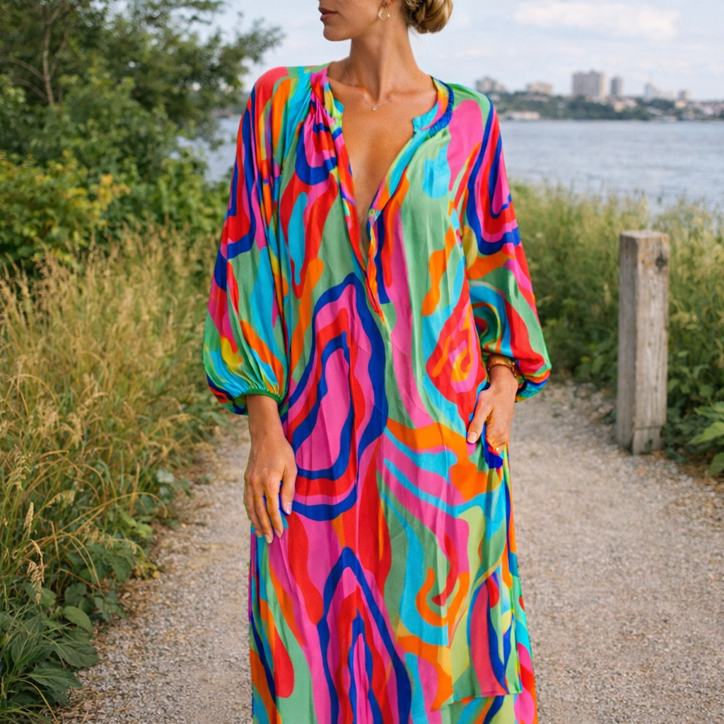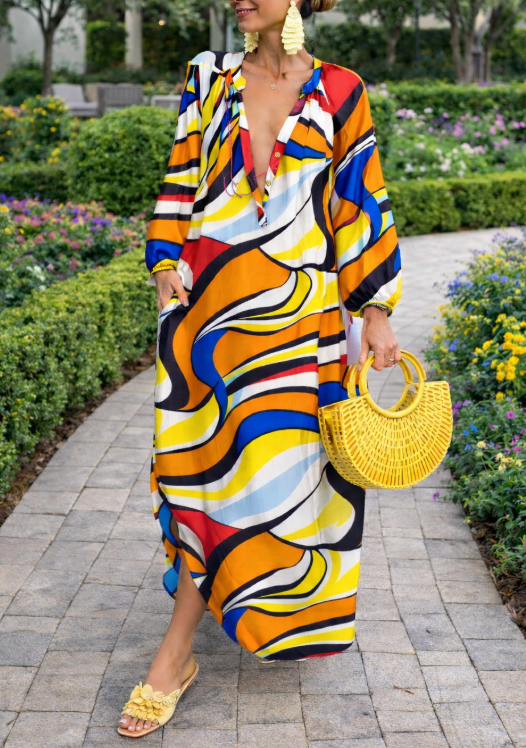 This women's kaftan dress is designed with a maxi length and an elegant V-neckline. The dress has long sleeves and a loose fit that provides both comfort and style. It is perfect for various occasions, from everyday activities to festive events. With its eye-catching pattern, it is a great part of your wardrobe for both casual and more dressy occasions.