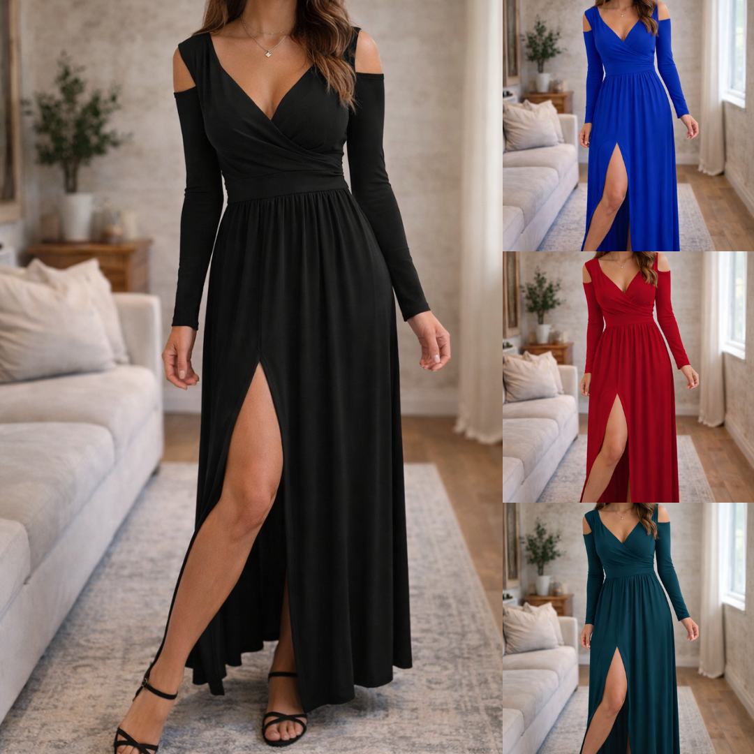 This women's maxi dress features an elegant wrap design and long sleeves with cut-out details. With a high slit, it offers a sophisticated look that is perfect for special occasions and evening events. The dress is easy to style and can be combined with heels for an elegant look or boots for a more casual style.