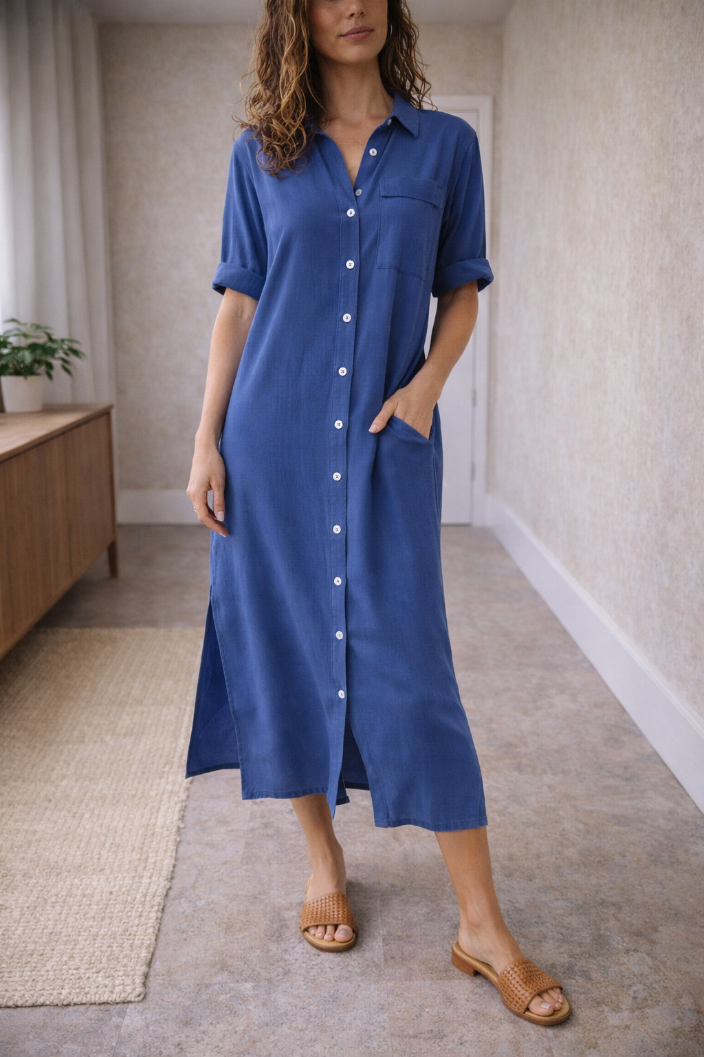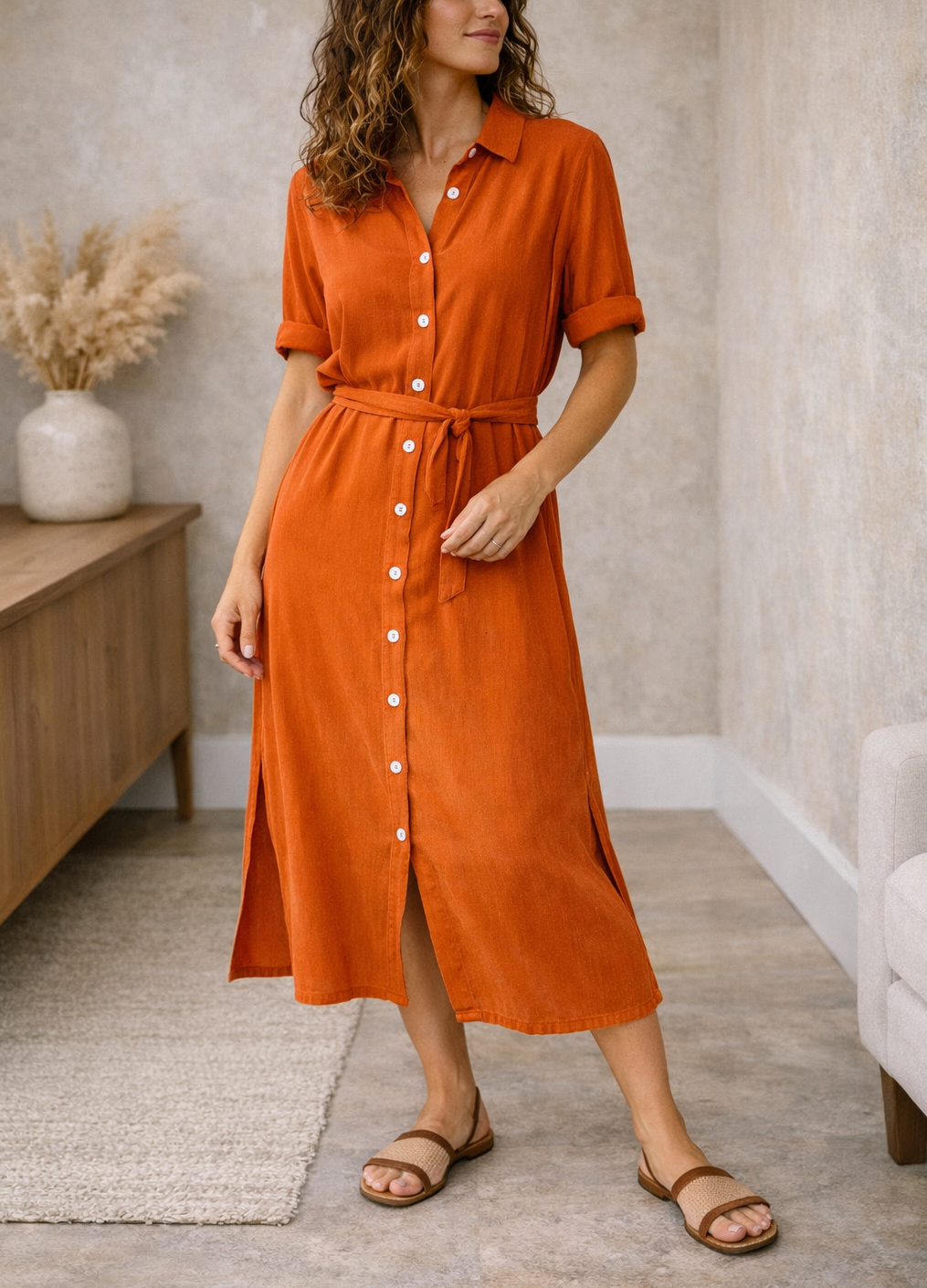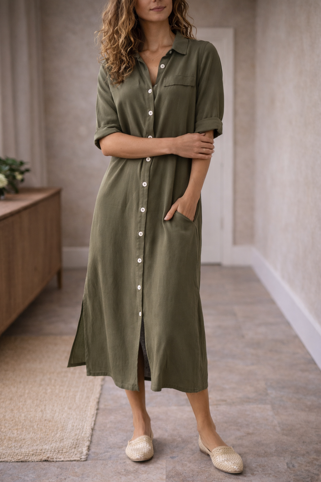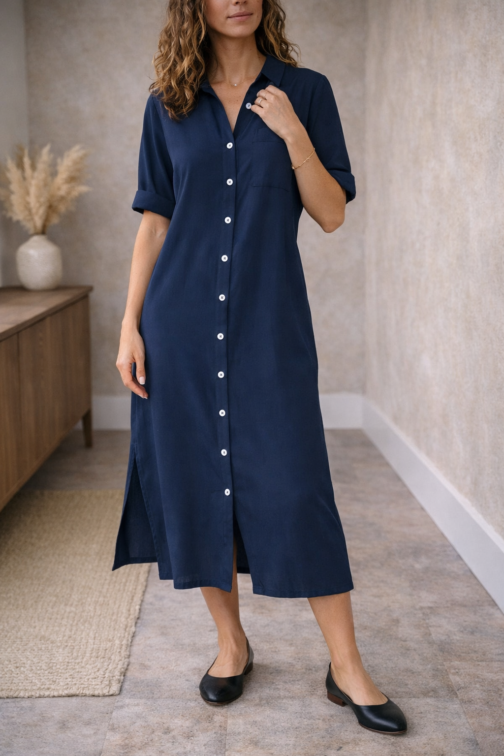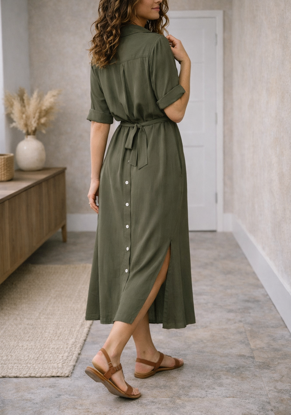 This button-front midi dress offers a timeless silhouette that's perfect for both casual and dressy occasions. The dress features a flirty midi hem and a matching belt that accentuates the waist for a flattering look. With three-quarter sleeves and a lightweight, breathable construction, it's both comfortable and stylish.