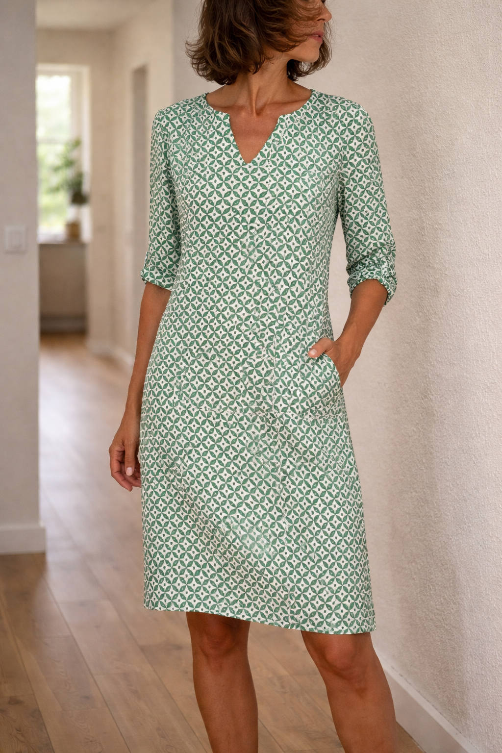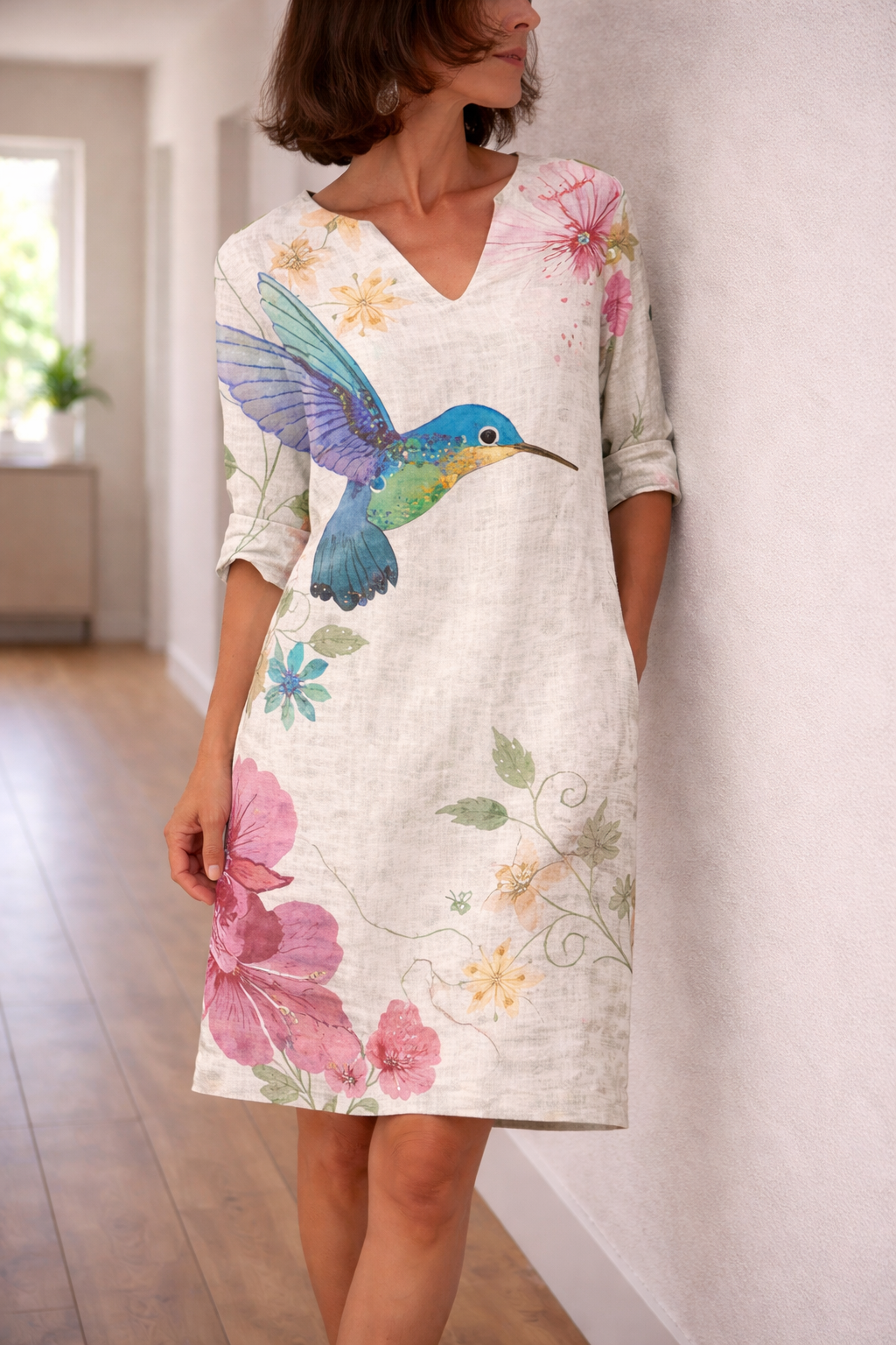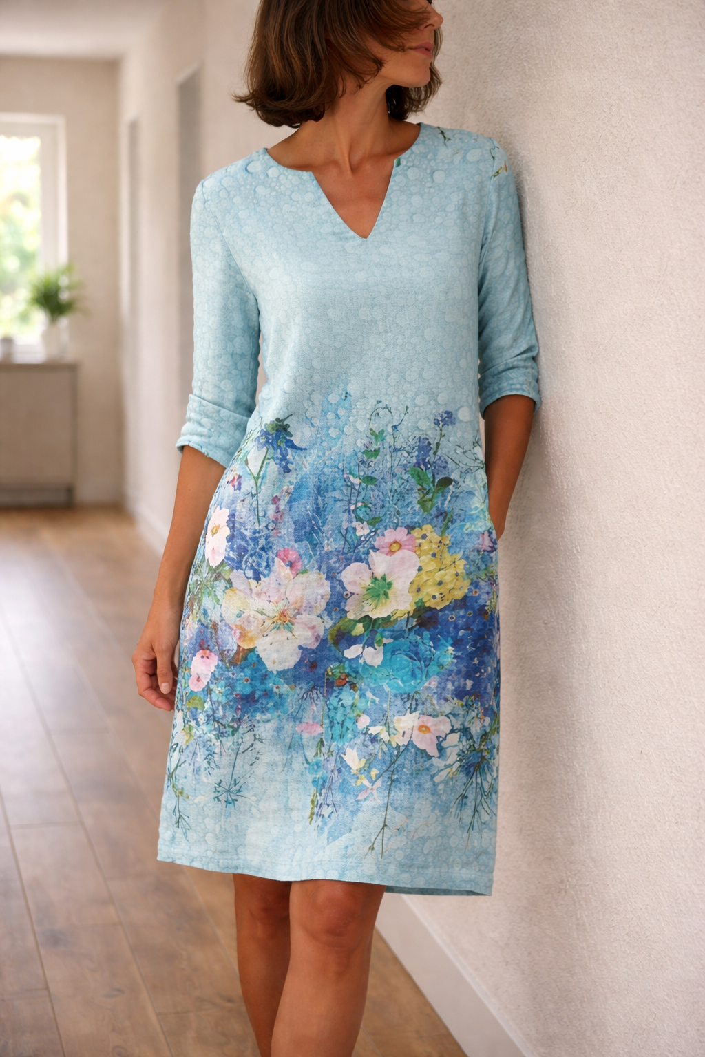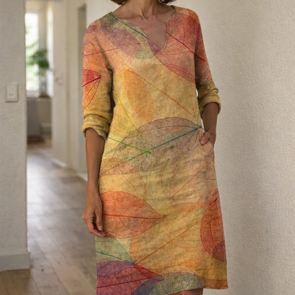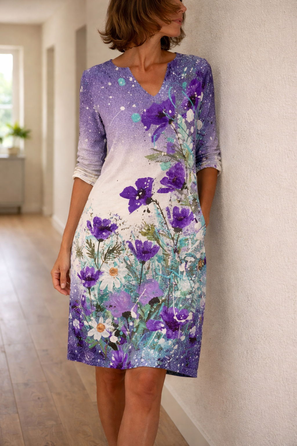 This floral dress with a V-neck is perfect for a casual yet stylish look. The dress has a loose fit and half-length sleeves, making it ideal for everyday wear and adding a feminine touch to your wardrobe.