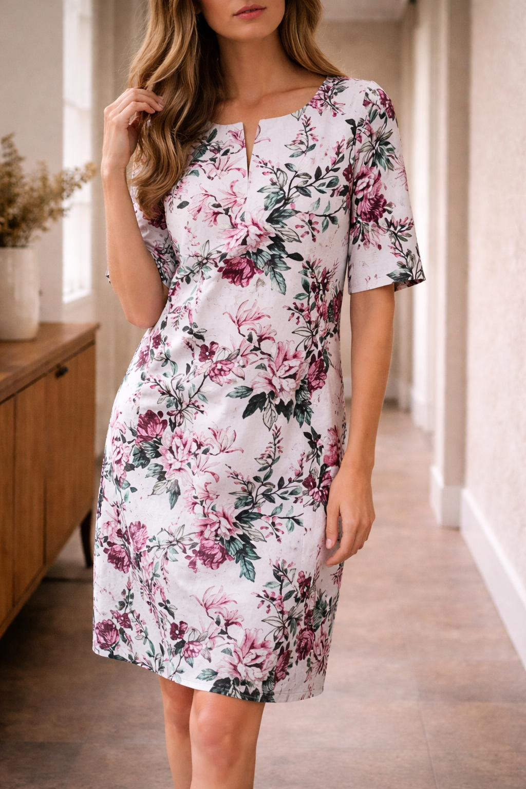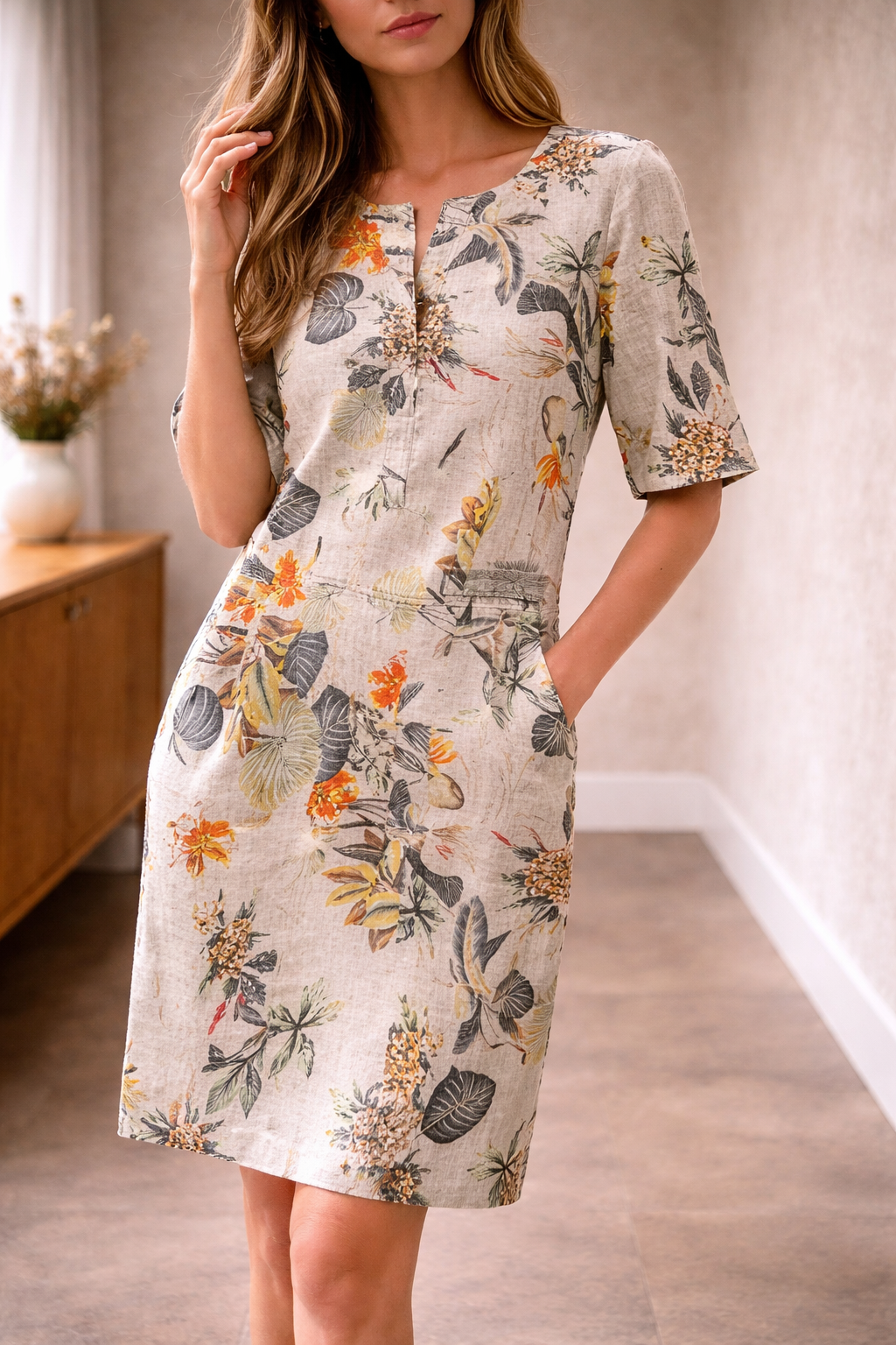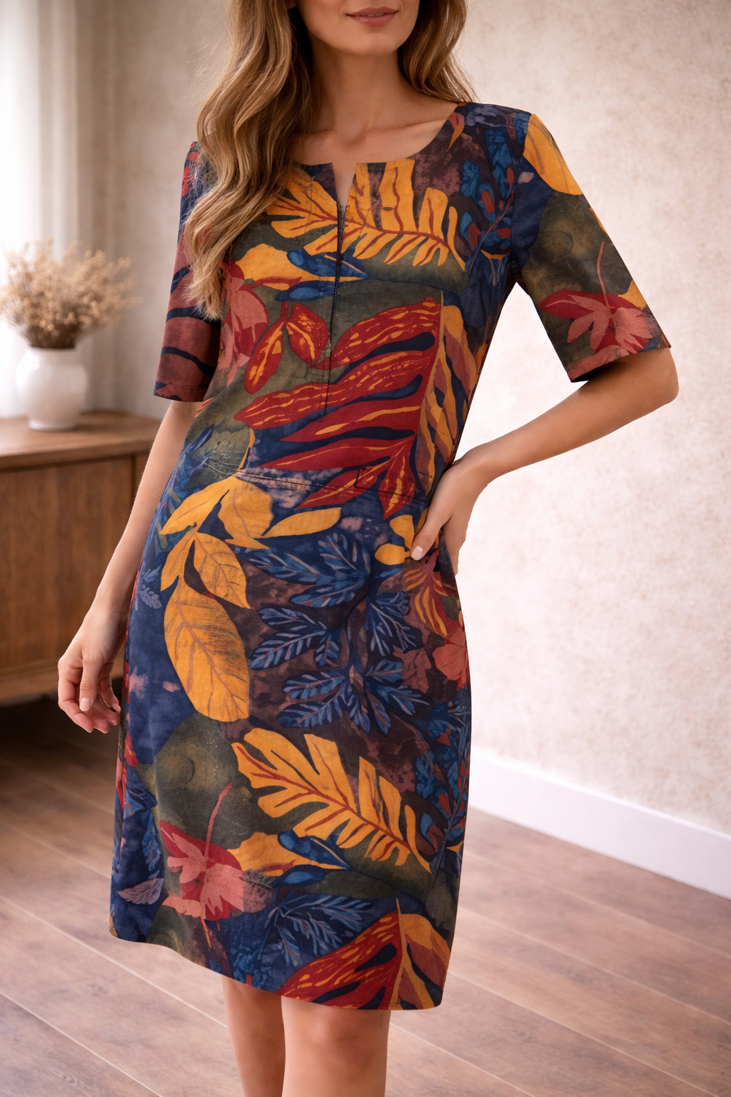 The Fanny Midi Dress is an elegant dress with a harmonious blend of rich autumn colors and tropical leaves. The relaxed, flowing silhouette offers both comfort and style. The dress has a round neckline and half sleeves, making it perfect for a variety of occasions. This dress is a versatile addition to your wardrobe and is great for both daytime and evening events.