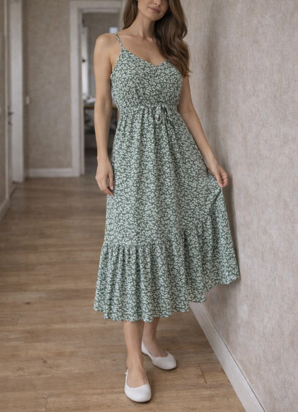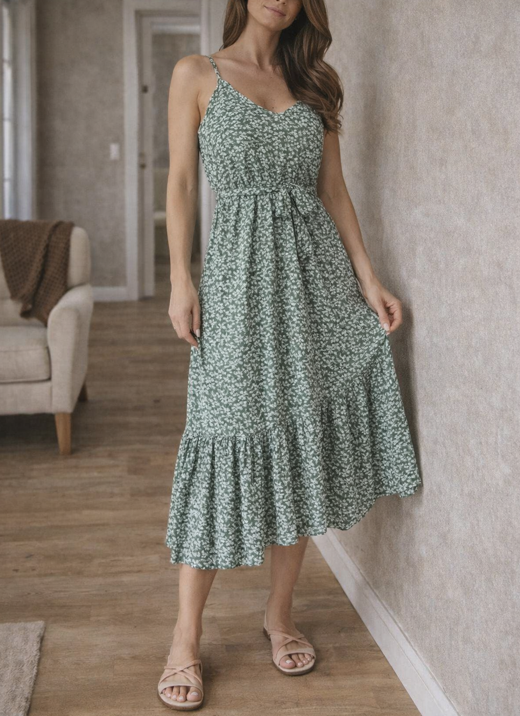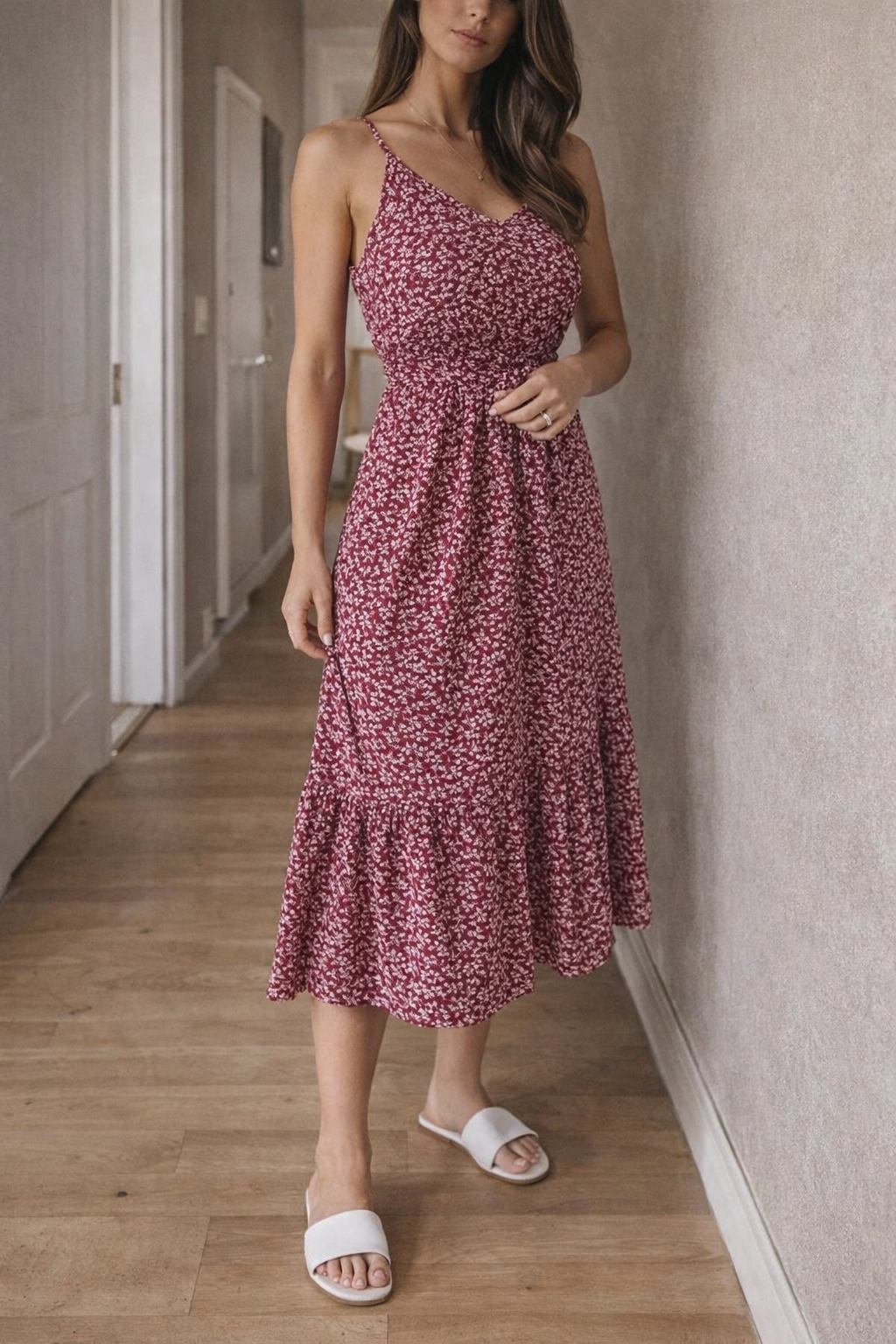 The Miranda Midi Dress is an elegant and versatile dress that is perfect for the spring and summer season. It features a V-neckline and adjustable spaghetti straps that provide a customizable fit. The dress has a high-low hem that moves beautifully with every step, giving a playful feel. The floral pattern adds a romantic touch, making it ideal for a variety of occasions.