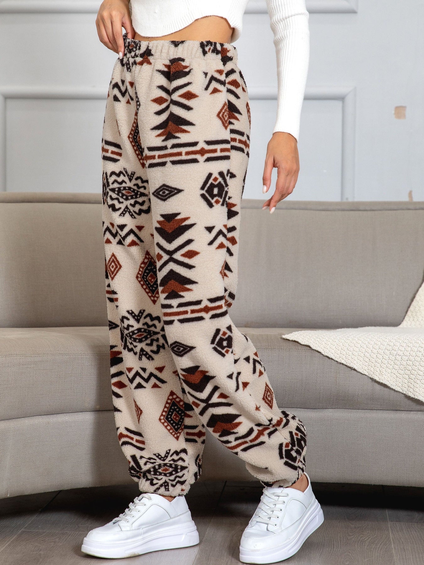 The Celeste Sweatpants feature a trendy Aztec pattern, making them a stylish choice for the colder months. Designed for comfort, these pants are crafted from soft teddy fabric, providing warmth and a cozy feel. The elasticated high waist and tapered legs ensure a flattering silhouette, making them suitable for both lounging at home and casual outings.